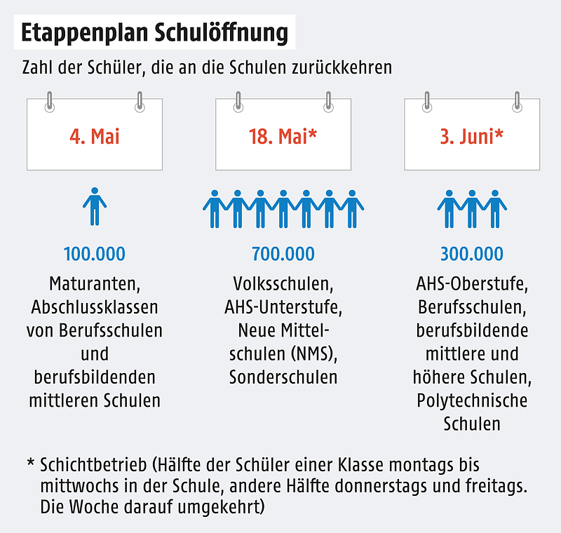 - Ab 18. Mai folgen die Pflichtschulen für alle 6- bis 14-Jährigen, also Volksschulen, AHS-Unterstufen, NMS und die Sonderschulen.